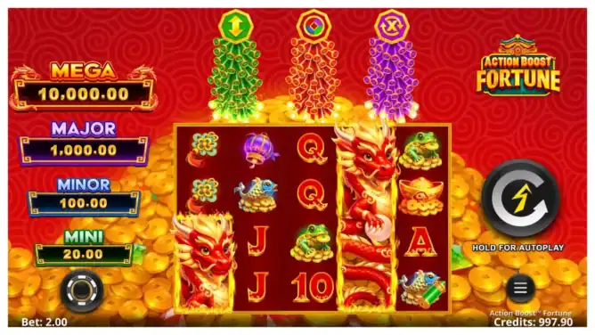 After each spin, Random Reveal symbols transform into standard icons such as Ingots, Frogs, Fish, or high-card symbols. However, they may also reveal Green, Red, or Purple Rockets. These Rockets collect into corresponding Firecrackers positioned above the reels. When one or more Rockets appear during a spin, there is a chance to trigger Action Boost™ Free Spins.