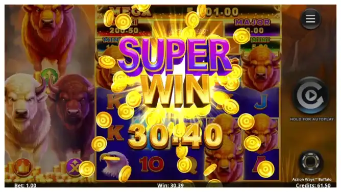 Set on 5 reels and 4 rows, Action Ways™ Buffalo features 1024 to 2400 ways to win, depending on reel configuration. Wins form left to right by matching symbols on adjacent reels. The bet structure is based on a fixed ways cost of 10, ensuring consistent value across spins.