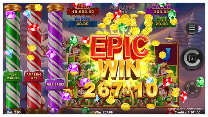 Amazing Link™ Christmas Boost operates on a classic 5×3 layout with 20 paylines, keeping gameplay intuitive even as the features grow more advanced. The Wild Elf symbol supports strong line hits, while 6 or more Amazing symbols trigger the fan-favourite Amazing Link™ respins. These respins lock all Amazing symbols and continue resetting whenever new ones appear, making the Mega prize achievable with enough perseverance and luck.