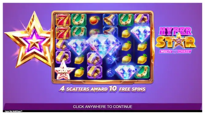 Hyper Star MultiChase™ may not feature traditional jackpots, but it delivers the same thrill. Wins can hit anywhere on the reels with the Pay Anywhere system, and Rolling Reels™ keep the action flowing. Multipliers stay on screen until cascades end, climbing sky-high during Free Spins thanks to the Rising Rewards™ mechanic. With so many ways to build your winnings, it’s a slot that feels like a jackpot chase every spin.