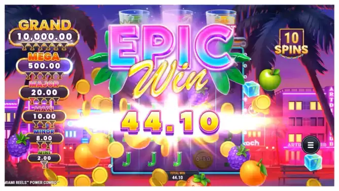 Miami Reels™ Power Combo™ takes the Power Combo™ mechanic to a whole new level. It’s fast, flashy, and full of surprises — from coin collections to fruit upgrades and growing multipliers. The gameplay constantly evolves, giving players control over how their bonuses combine. With a max win of 10,000× bet, this slot is pure jackpot paradise.