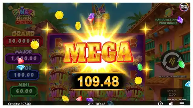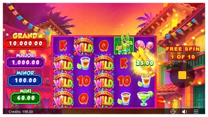 With 5 reels, 4 rows, and 20 paylines, Piñata Rush Express™ delivers fast-paced, high-volatility action. An RTP of 96.45% supports cascades, multipliers, and coin rewards that can strike at any moment. Bonus rounds, including free spins and jackpot wheel rewards, ensure the fiesta never stops.