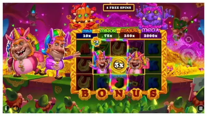 The Red and Green Leprechauns work as Collect symbols, scooping up all coin values on the screen, upgrading them before collecting, and potentially adding mushrooms that trigger Free Spins. Jackpot coins expand Mini, Minor, Major, and Mega prizes — all of which reset only after a win.